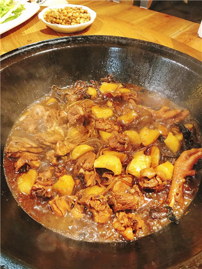 鐵鍋燉笨雞 山間散養(yǎng)的笨雞,只吃草籽和蟲(chóng)子,在林子里奔跑150天,才完全長(zhǎng)成。小笨雞下鍋,加上蘑菇、粉條,小火慢燉,肉質(zhì)酥爛、香醇誘人。